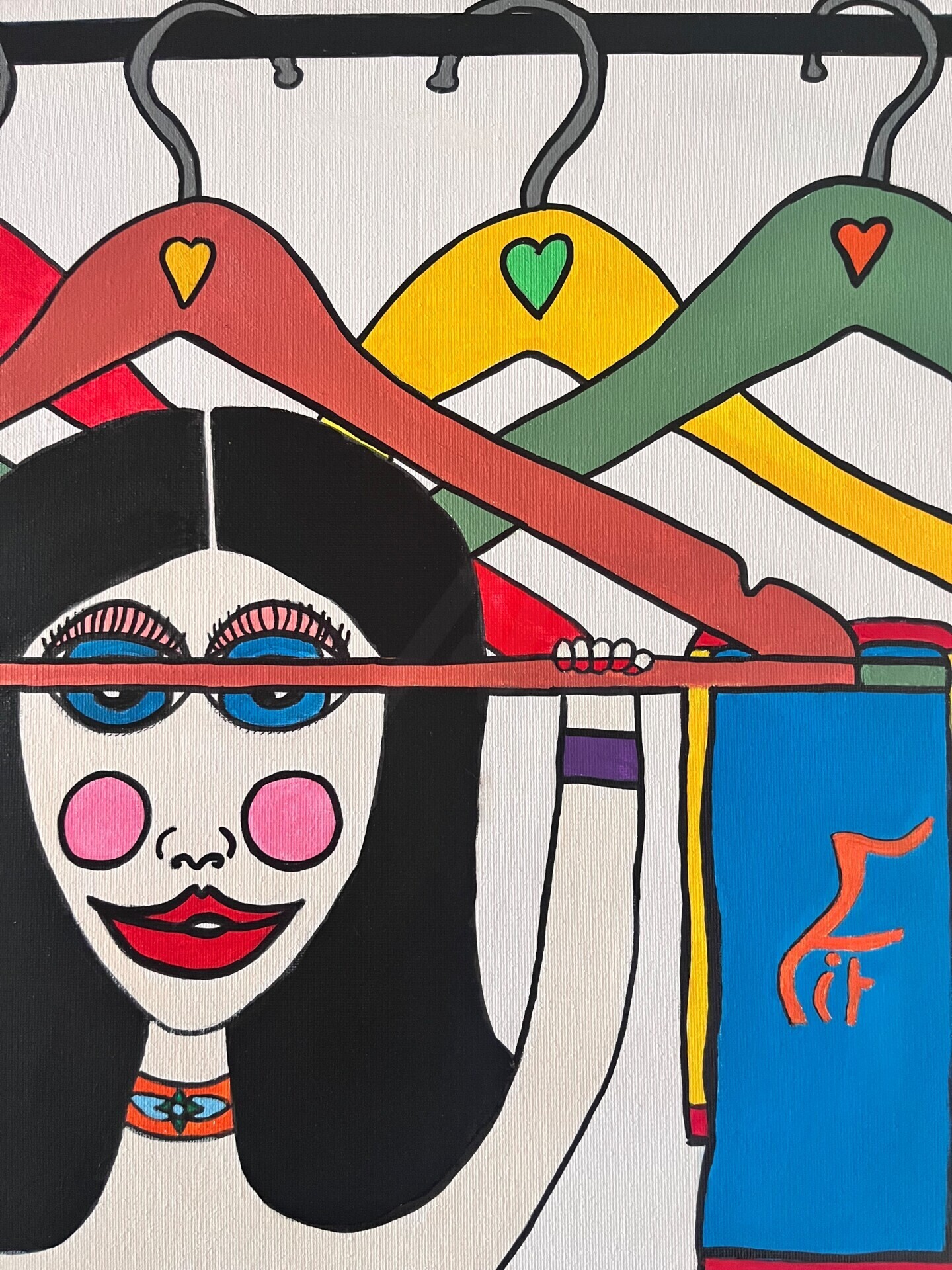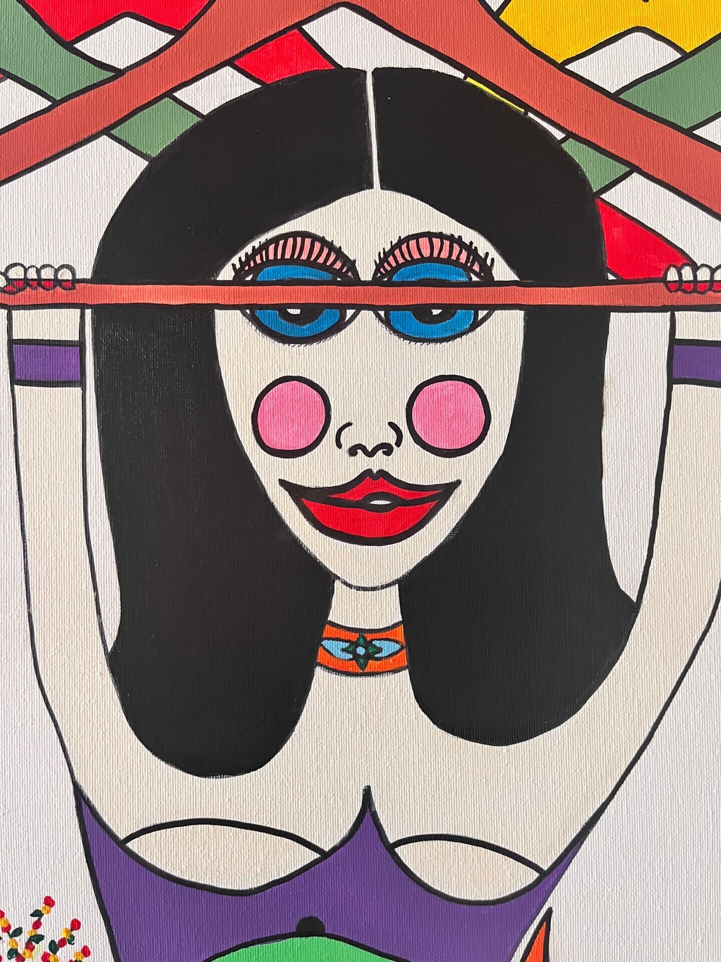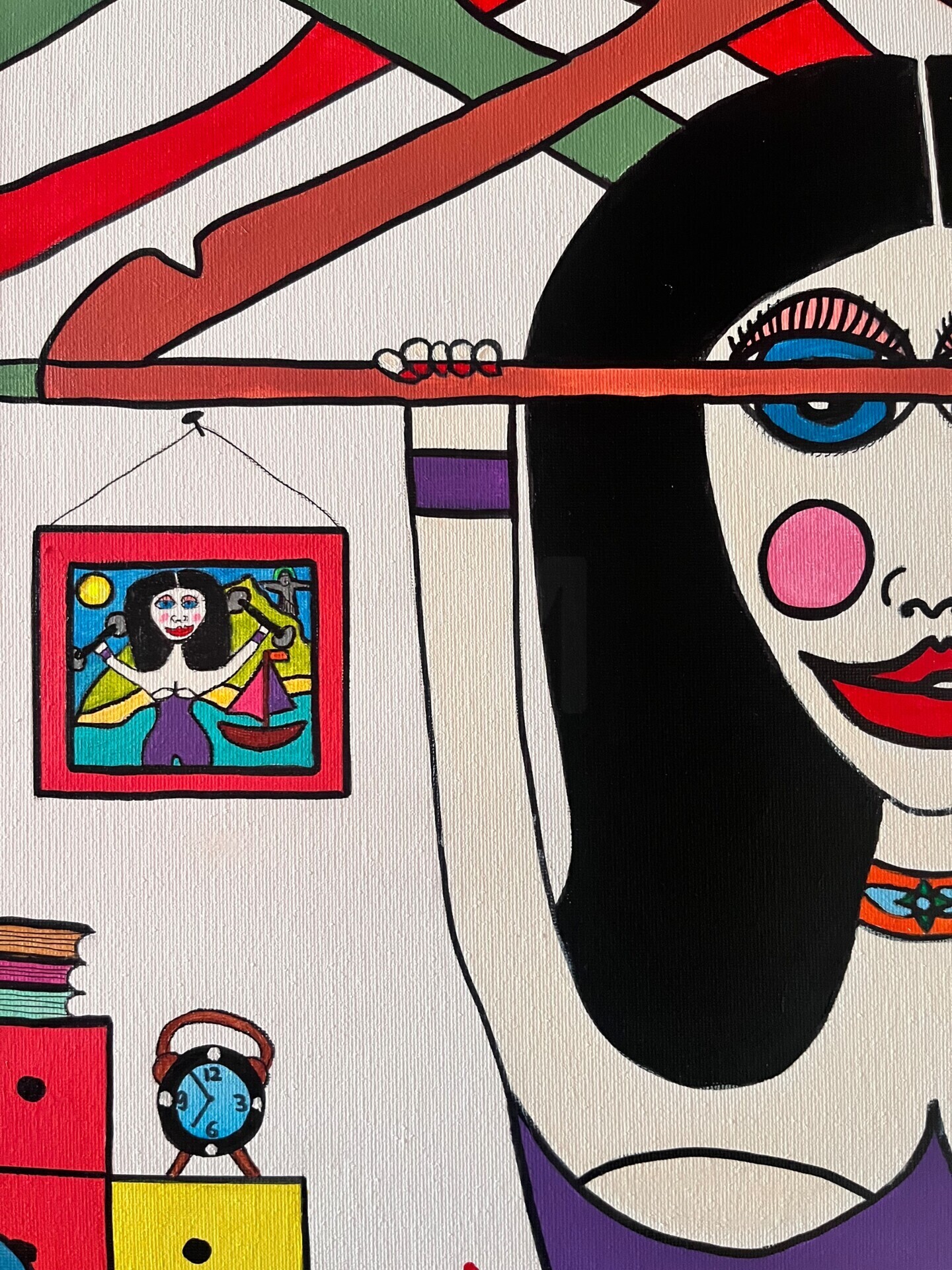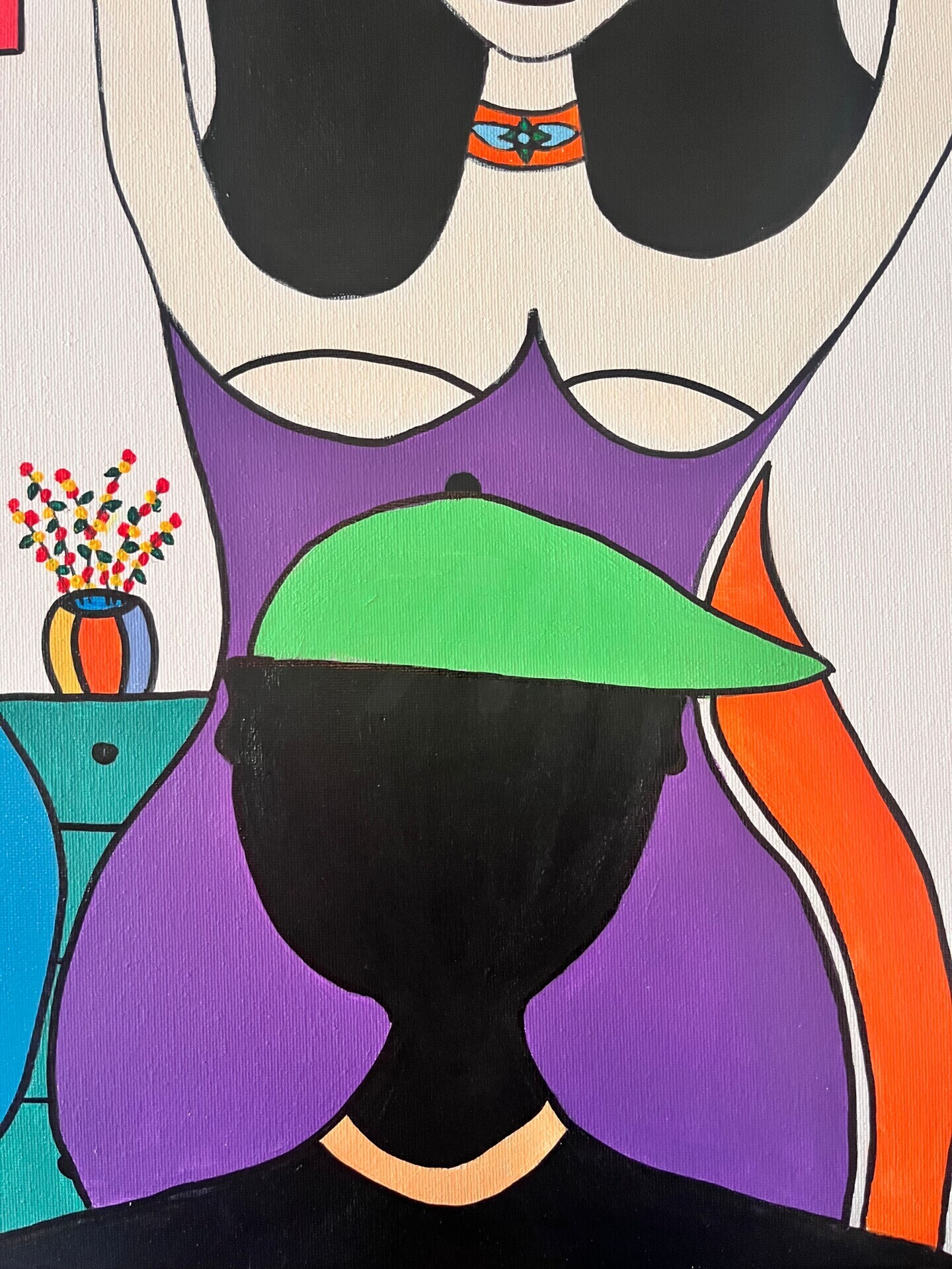 This painting is about resourcefulness, humour, and the way we stage ourselves through sport and appearance.