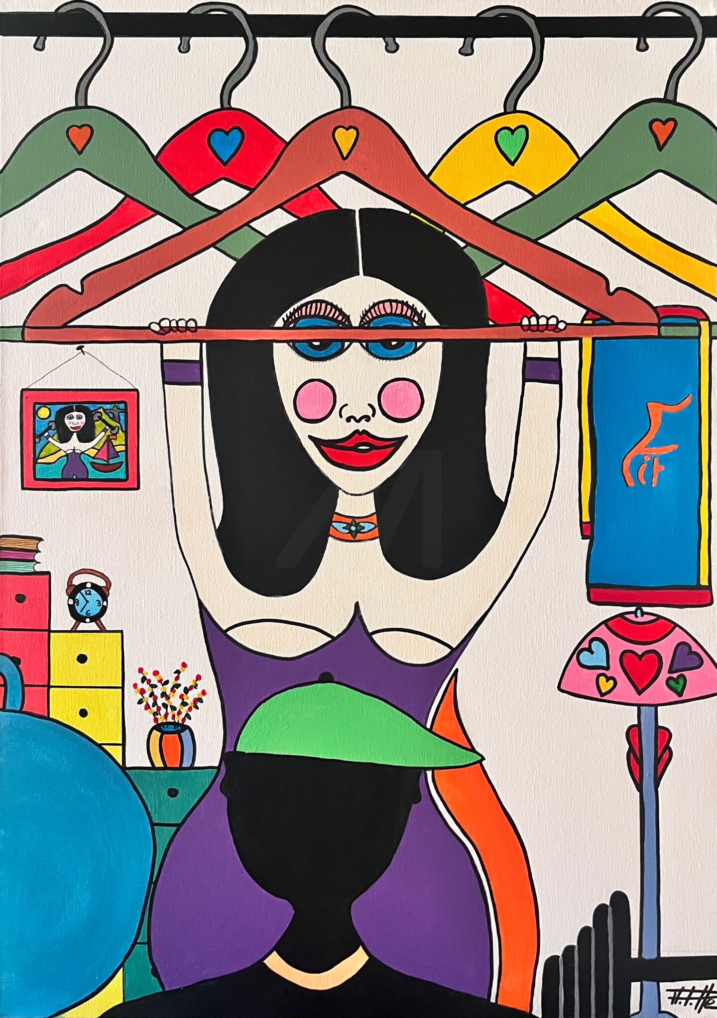 My heroine trains at home, accompanied by her partner, who voluntarily takes on the role of her coach. She cannot afford the sophisticated equipment usually found in fitness clubs: so she invents her own solutions. She diverts her clothes rack — hangers, hooks — with imagination and generosity, in order to compensate for her limited resources.