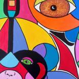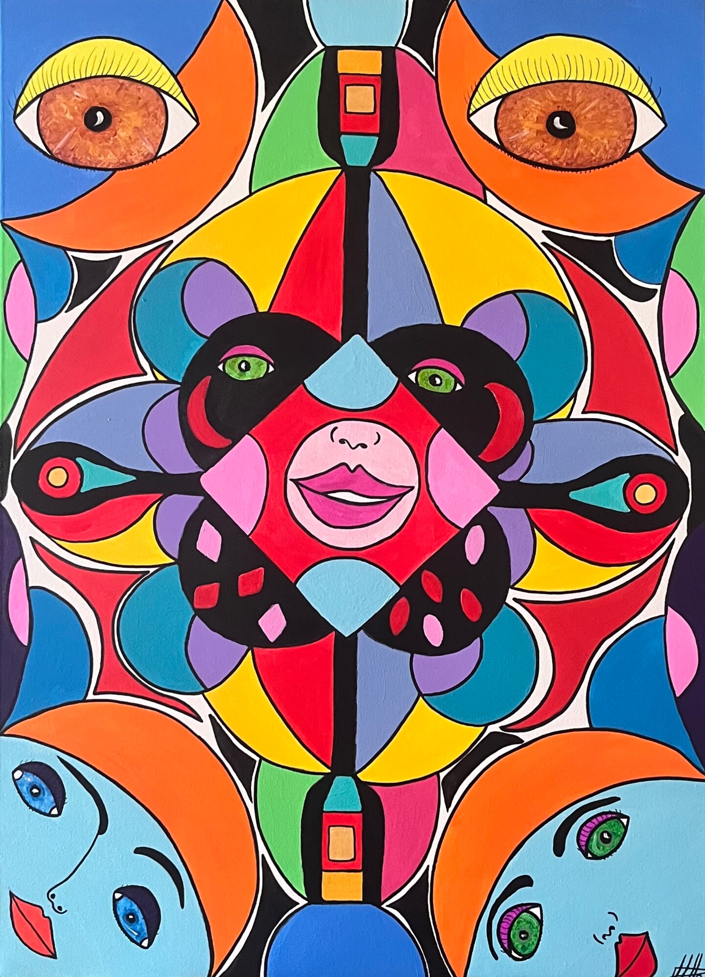 Dans cette œuvre, j’ai voulu explorer la multiplicité des regards, des émotions et des identités. Le visage central symbolise le noyau de notre être, tandis que les formes colorées qui l’entourent représentent la manière dont nous nous percevons et dont le monde nous renvoie une image parfois fidèle, parfois déformée.