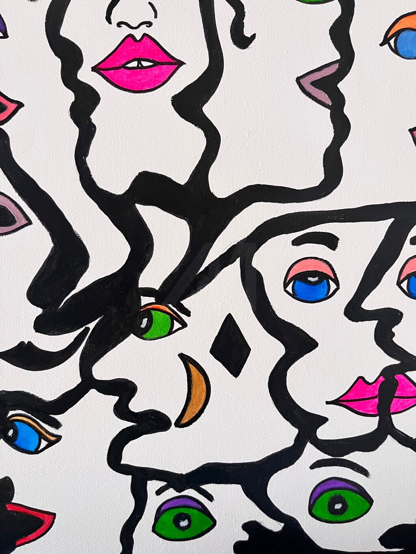 Les couleurs vives traduisent la vie, la pluralité des émotions, tandis que les lignes noires relient et séparent à la fois comme les frontières invisibles entre les êtres.